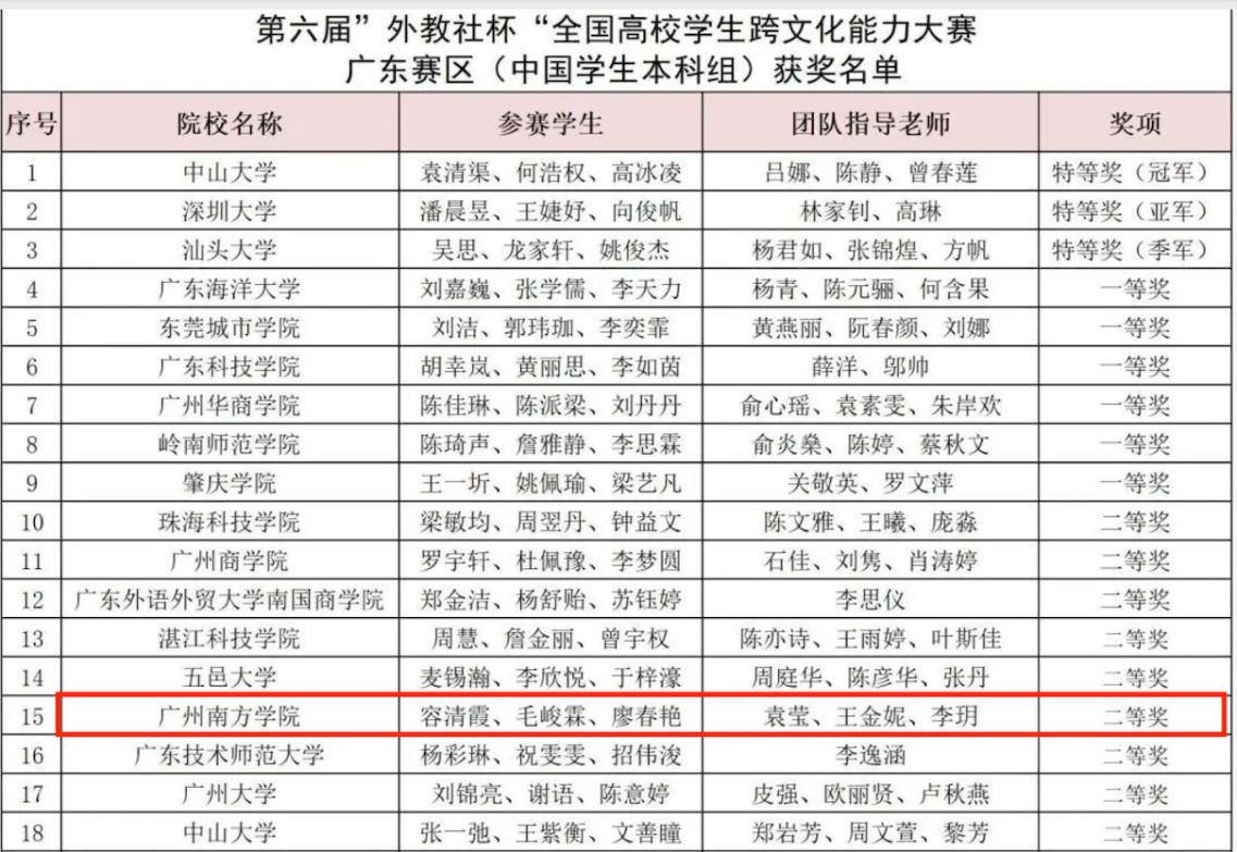 11月25日,第六届“外教社杯”全国高校学生跨文化能力大赛广东赛区决赛落下帷幕。威廉希尔中文网站学生容清霞、毛峻霖和廖春艳在威廉希尔中文网站教师袁莹、王金妮和李玥的指导下,获得省级二等奖。