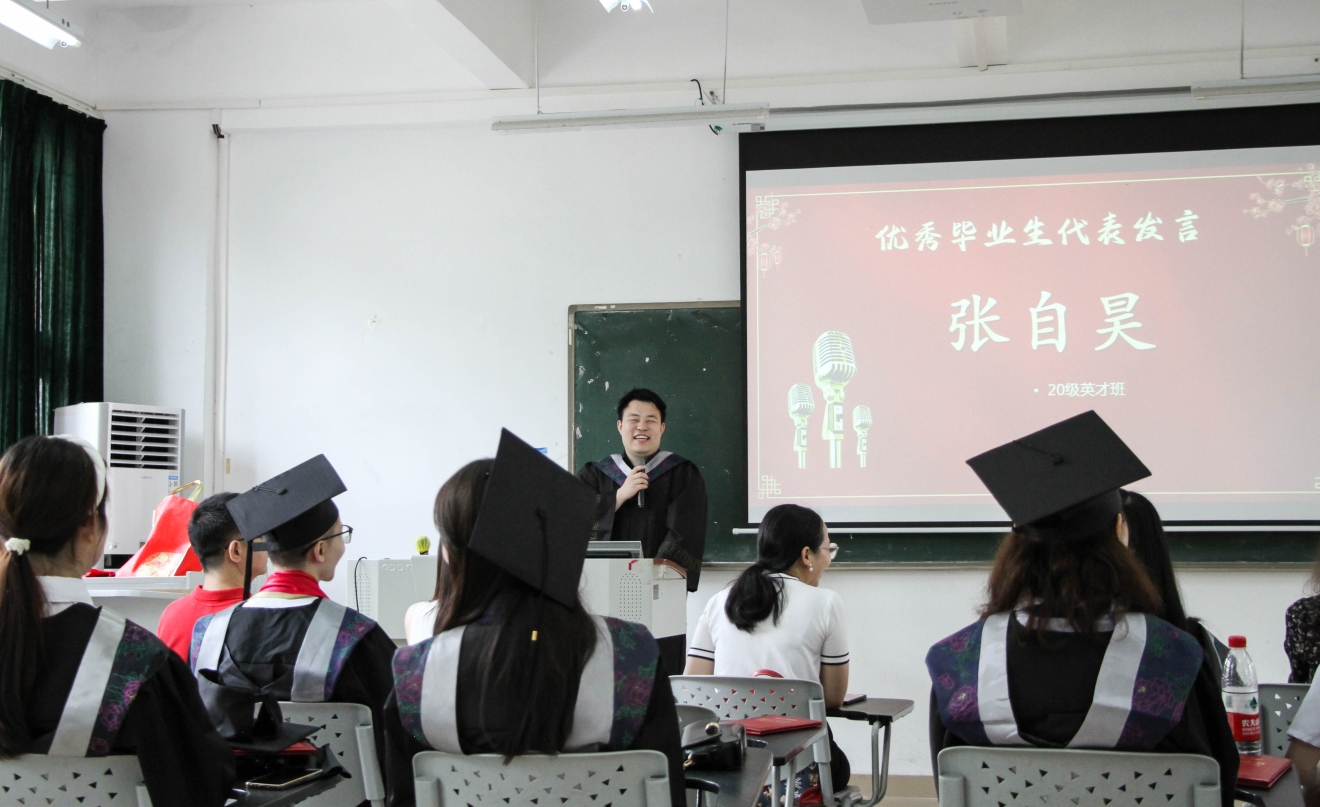 随后,优秀毕业生代表张自昊同学发言,分享了自己在英才班学习的收获和感悟,表达了对老师们的感谢和对同学们的祝愿,也表达了对美好未来的期许。
