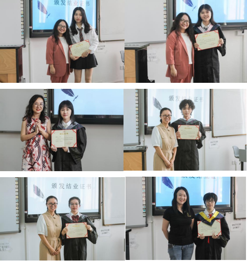 接着,英才班教师团队依次为本届毕业生颁发结业证书。证书从教师手中传递到毕业生手中,象征着师生之间英语技能的传承、人文知识的传播、以及拼搏奋斗精神的传续。