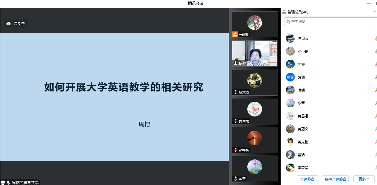 10月19日,威廉希尔中文网站利用腾讯会议举行了题为“如何开展威廉希尔中文网站教学的相关研究”的讲座,由周榕教授主讲,陈剑波主任主持,全体大英教职工参加了讲座。
