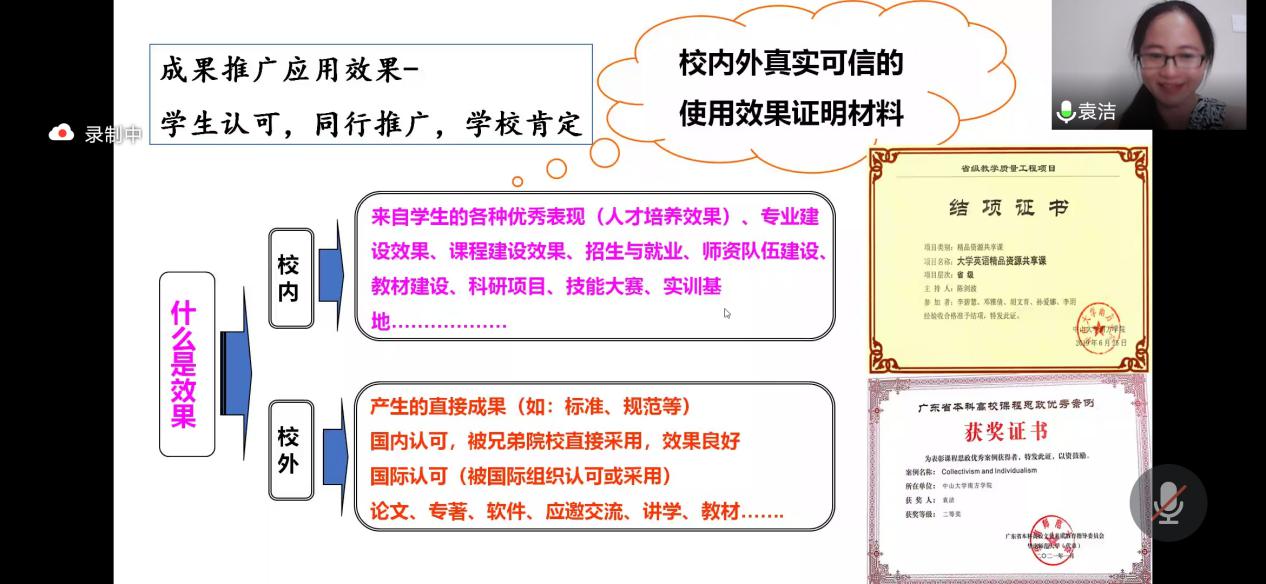 作为教师,除了认真完成教书育人的职责,拥有属于自己的教学成果,也能给职业生涯添上浓墨重彩的一笔。2021年6月30日下午,广州南方学院威廉希尔中文网站(以下简称大英中心)通过腾讯会议平台开展了“教学成果奖申报经验分享会”。我中心校级教育教学成果二等奖获得者袁洁老师作为主讲人,以她获得的教学成果为范本,给大家分享了申报项目的经验和注意事项,应用型威廉希尔中文网站研究中心负责人韩羽博士主持,大英中心全体教职员参会。