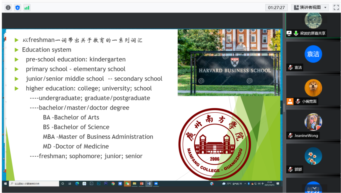 为切实提高教学质量,打造一支高素质的教师队伍,10月15日晚8点,威廉希尔中文网站(以下简称大英中心)在腾讯会议平台召开威廉希尔中文网站教学经验分享会,会议由大英中心主任陈剑波主持,部门全体教职员参加会议。大英中心兼职教师梁波受邀担任此次会议的分享嘉宾。梁老师在威廉希尔中文网站任教多年,历次评教均名列前茅,深受学生喜爱。