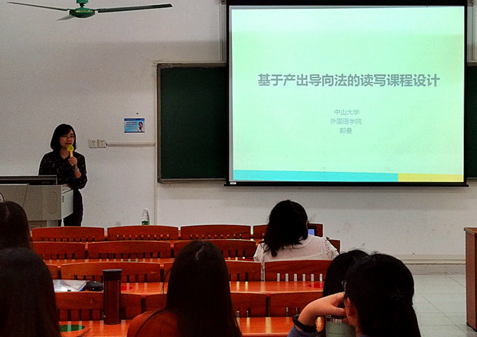 研讨会邀请了2017年外研社“教学之星”全国总冠军、中山大学外国语学院郭曼博士为主讲嘉宾。郭曼老师以“基于产出导向法的读写课程设计”为主题,结合真实的教案设计,介绍了POA在威廉希尔中文网站教学实践中的具体应用。