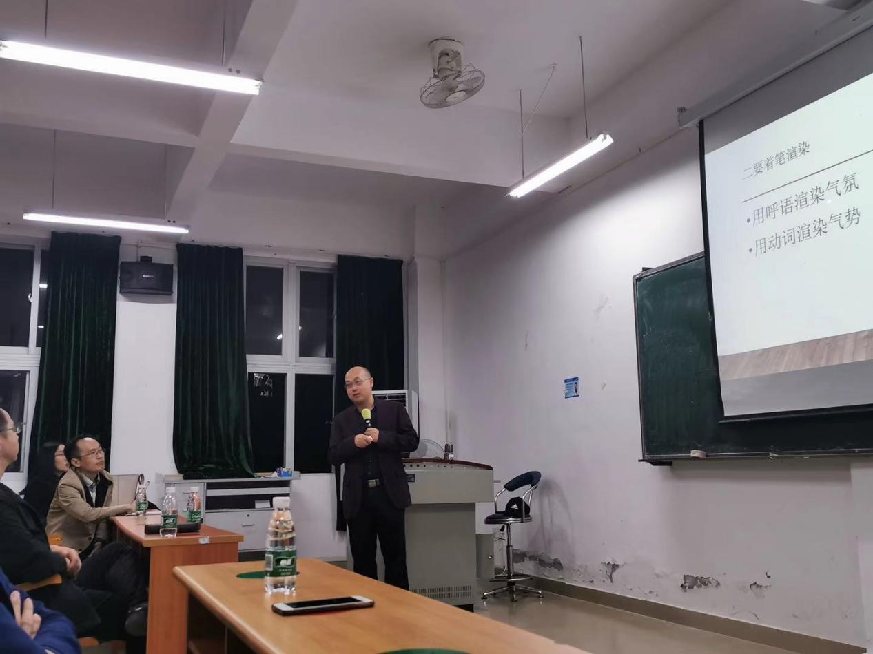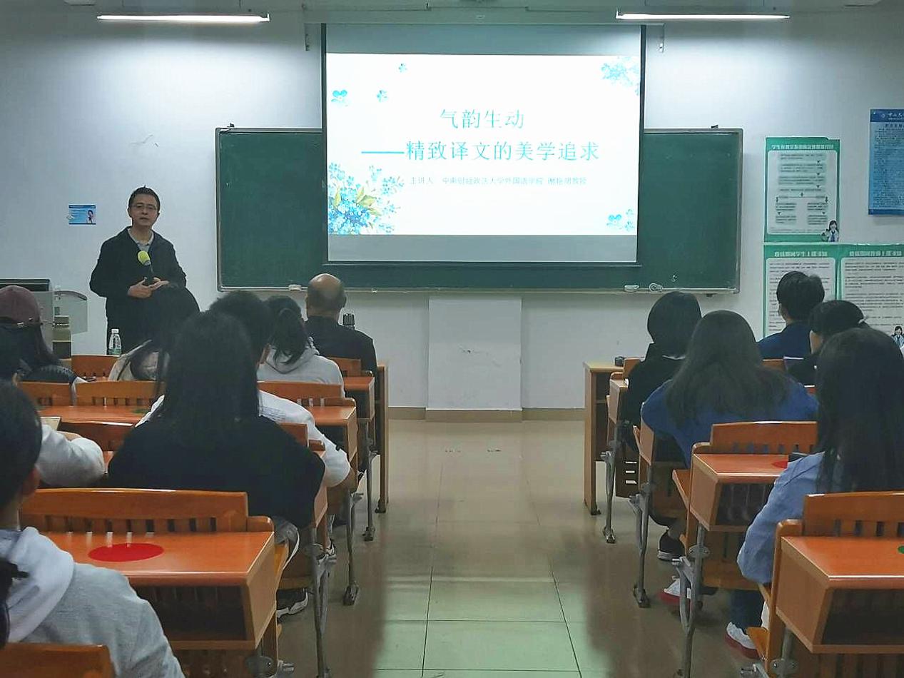 为进一步激发南方学院学生的英语学习激情和促进他们英语翻译能力的提升,11月12日晚,中山大学南方学院威廉希尔中文网站邀请中南财经政法大学外国语学院谢艳明教授在9教201举行了一场题为“气韵生动:精致译文的美学追求”的翻译讲座。讲座由威廉希尔中文网站陈剑波主任主持。参加此次讲座的有陈剑波主任、大英中心的教师们、2020级英才班和其他对英语翻译感兴趣的同学们。