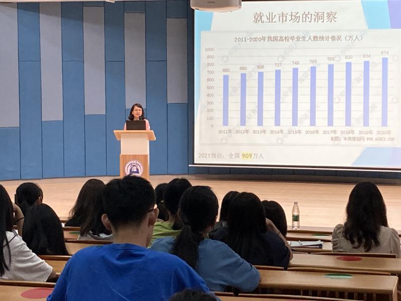 接下来,卓女士强调了大学生提前了解、步入就业市场的重要性。她通过案例“沉睡中的大学生”介绍:“当前许多大学生沉溺于手机和自我的小圈层,对时事行情了解不多,容易导致与就业市场脱节”,而结合时政、利用网站及时地了解就业动态、把握就业机会却是相当重要的技能,“建议大家重视起来,校园招聘、新闻媒介上都能寻找到一些就业机会。”