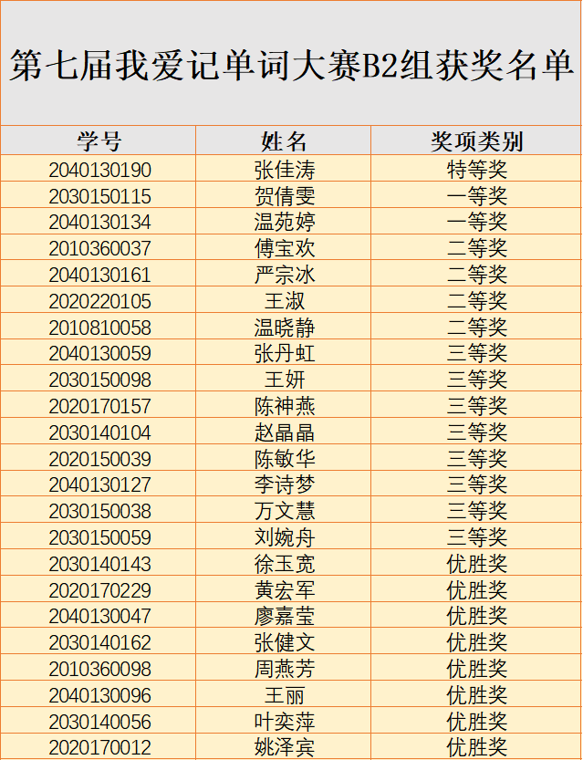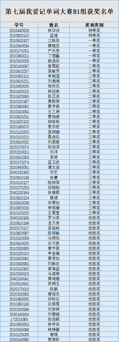 最终,马茵婷、谢泳琪、林华诗、蓝瑾和张佳涛获得了特等奖;姬语辰、杨欣潼、丁锶鑫、黄晓芬、江耿佳、卓明宇、严乐思、贺倩雯、温苑婷和施壮镖获得了一等奖。其他来自不同参赛组别的26名,38名和46名学生分别获得二等奖,三等奖和优胜奖。获奖名单中的学生(见下图),将获得本中心颁发的获奖证书以及威廉希尔中文网站课程期末总评成绩加分的奖励。