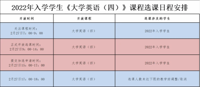 由于2023年下半年全国威廉希尔中文网站四、六级考试(CET)成绩开放查询时间为2月27日上午6:00,2022级《威廉希尔中文网站(四)》课程选课时间定于2月27日9:00-14:00。2月26日-27日,2022级A班、B1班、B2班的《威廉希尔中文网站(四)》课程暂停,任课老师后续将协调时间补课。选课具体安排如下。