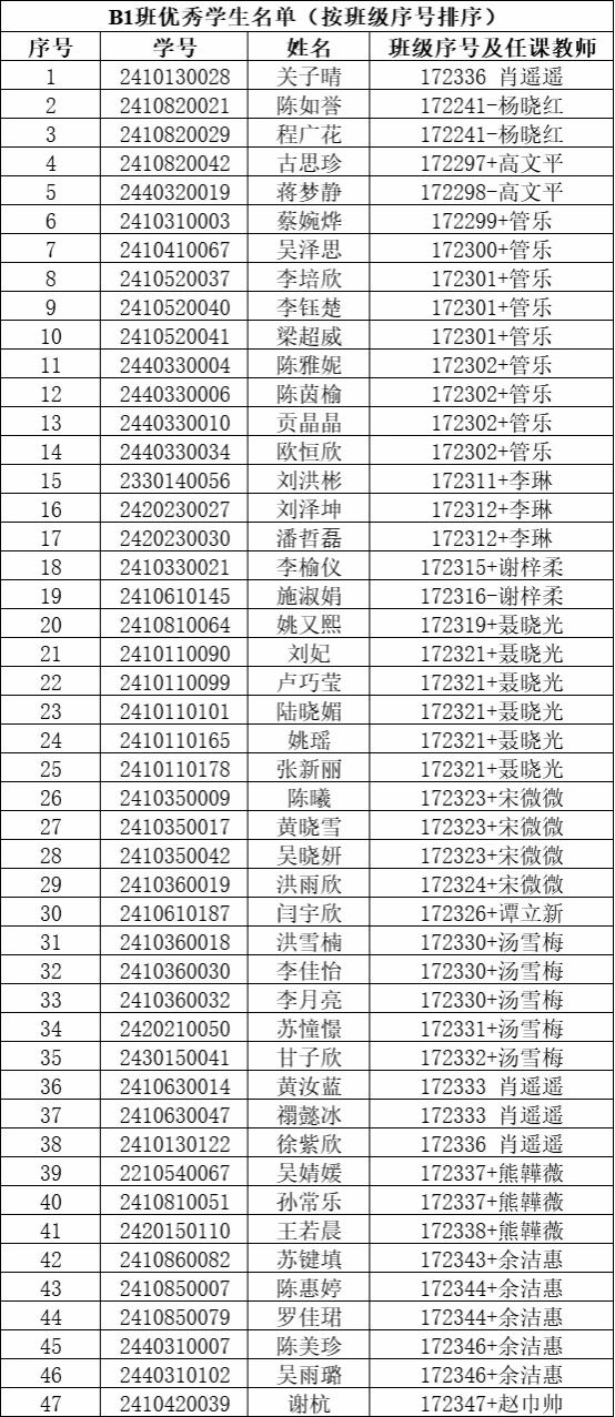 1. B1班学生第二学期期末成绩优秀(名单见附件2)可调至A班。