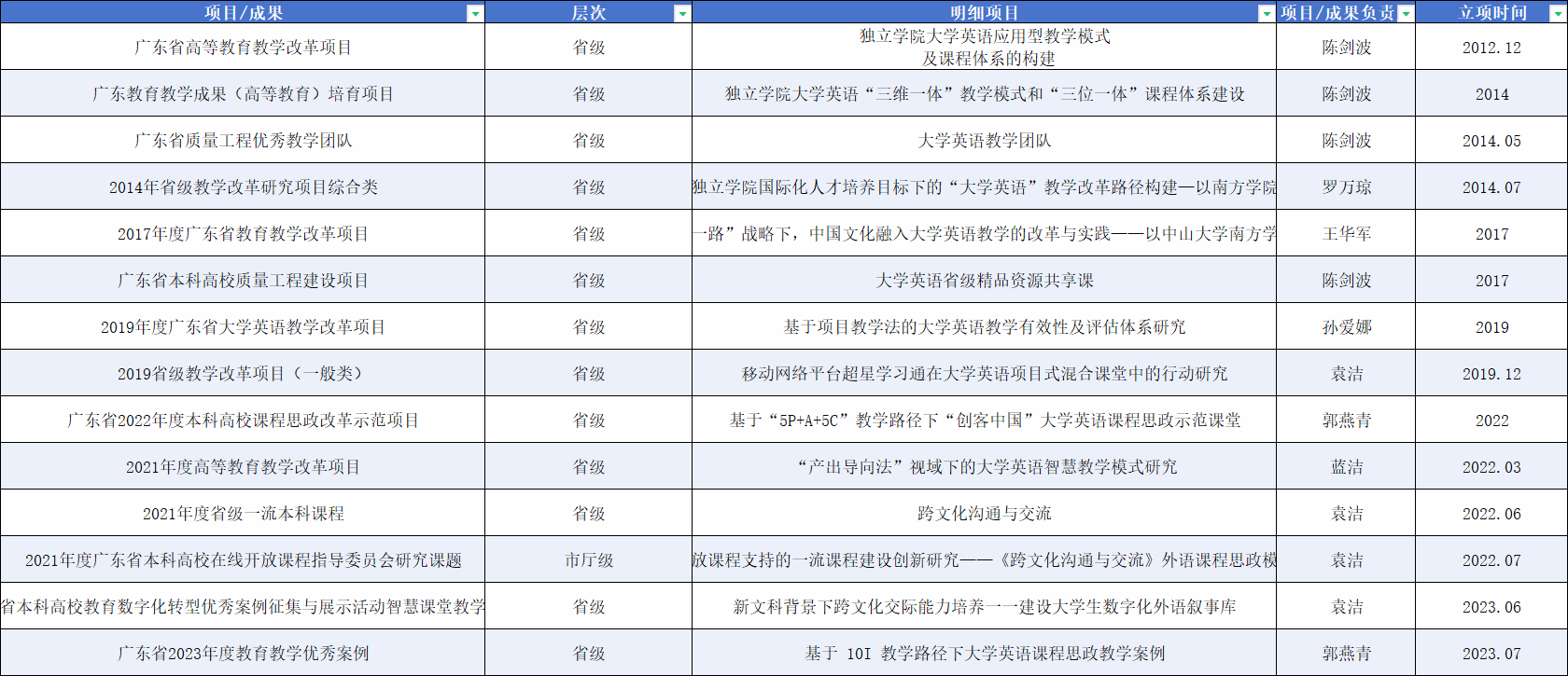 校级精品/一流课程: 《跨文化沟通与交流》、《商务英语》、《英语思辨性阅读》、《政商沟通英语》