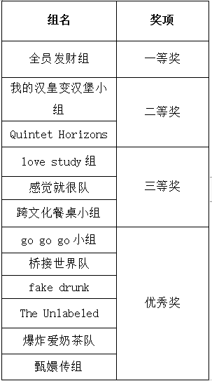本次大赛设一等奖1组、二等奖2组、三等奖3组和优秀奖6组。我们也将推选出三名选手组队代表广州南方学院出战11月份“外教社杯”全国高校学生跨文化能力大赛广东赛区的比赛。